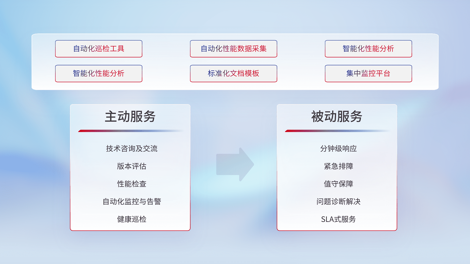 智能化工具和标准化文档,,保障服务质量,,,,提供主动服务(包含技术咨询、、版本评估、、、性能检查、、、、自动化监控与告警、、、健康巡检)和被动服务包含(分钟级响应、、、、紧急排障、、、、值守保障、、、问题诊断解决、、、SLA服务)。。。。