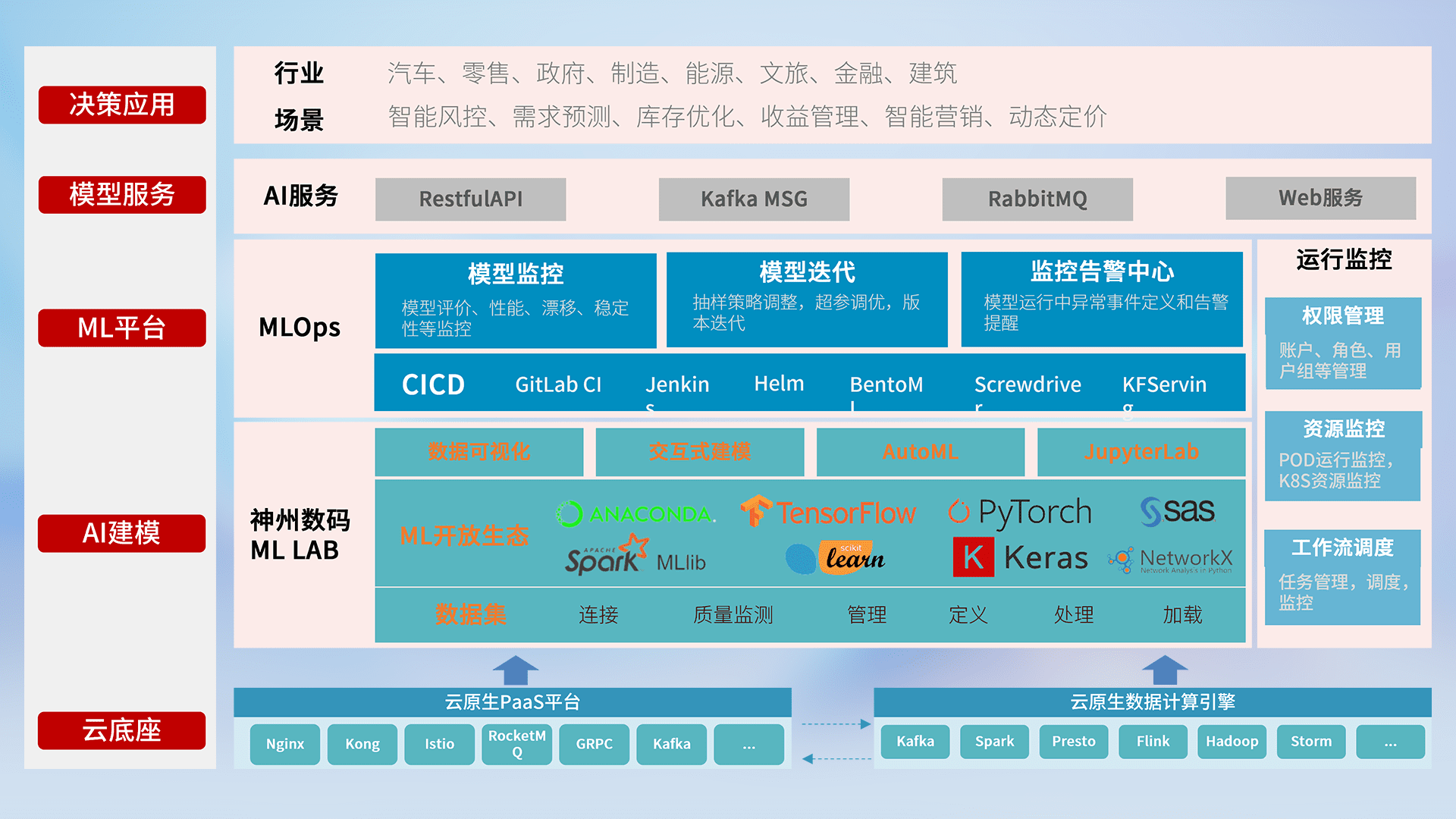 数据+模型双引擎驱动,,面向智能服务场景,,,快速灵活利用AI技术,,支持业务决策,,助力企业智能化转型破局。。